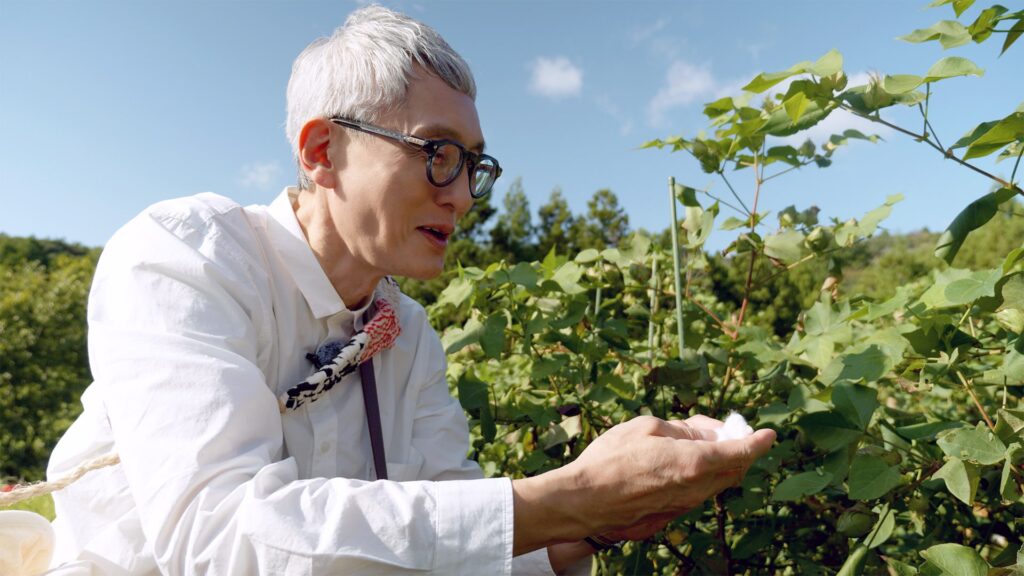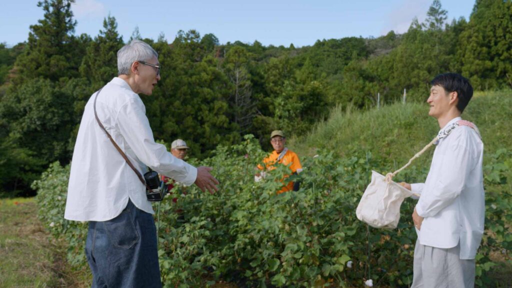 日本の棚田百選にも選定された美しい景観の一角で、綿花の栽培が行われている。現在、日本の綿花自給率は、ほぼ0%となってしまっているが、綿花から服ができるということを知ってほしいとHUISでは、この地で収穫された綿を混ぜたシャツの販売もしている。綿花に触れるのは初めてだった松重も、収穫体験をさせていただいた。