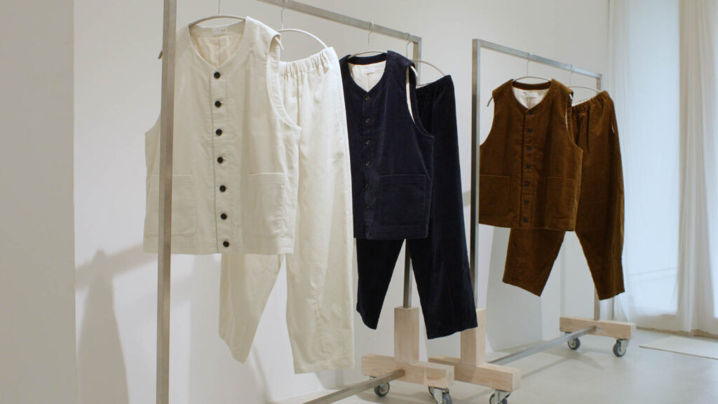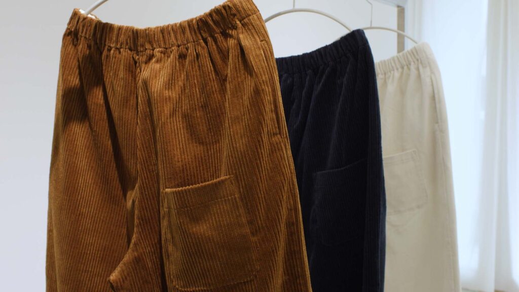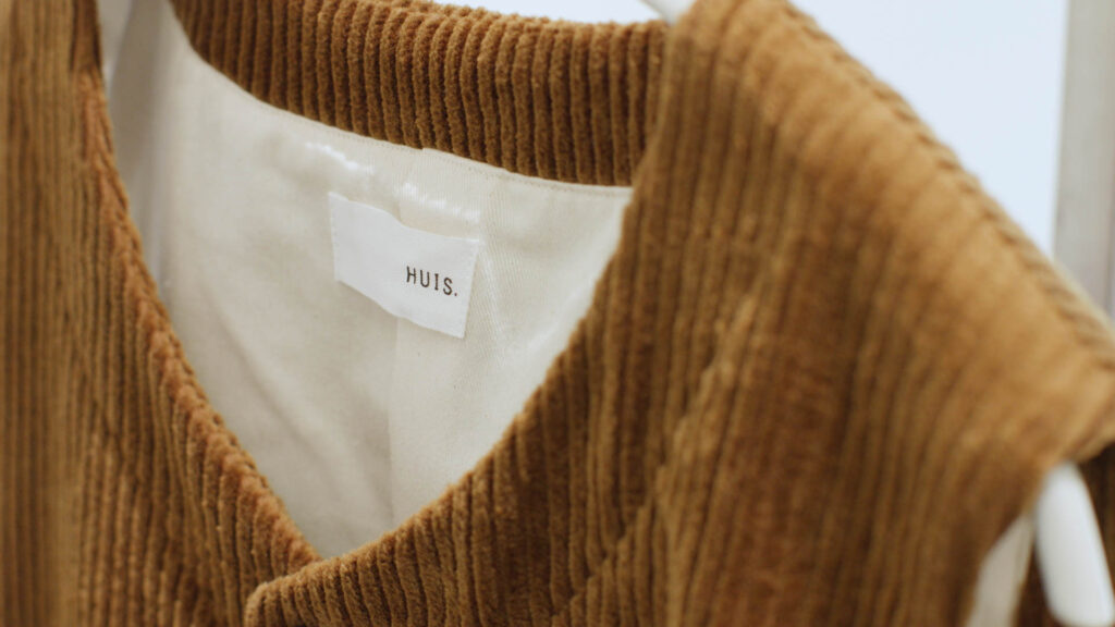 浜松市中央区にあるHUISのショールームで遠州コーデュロイのベストとパンツを見せてもらった。ボリューム感のあるコーデュロイだが、やわらかく、想像以上に軽い。