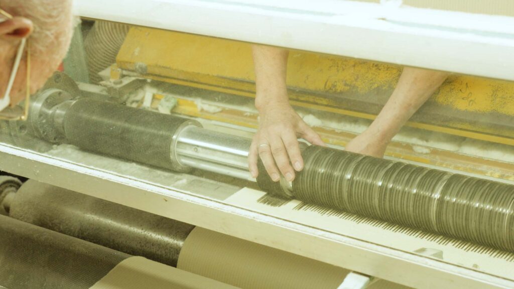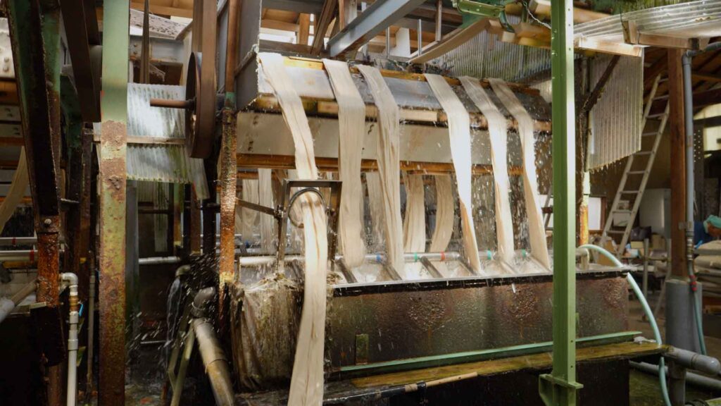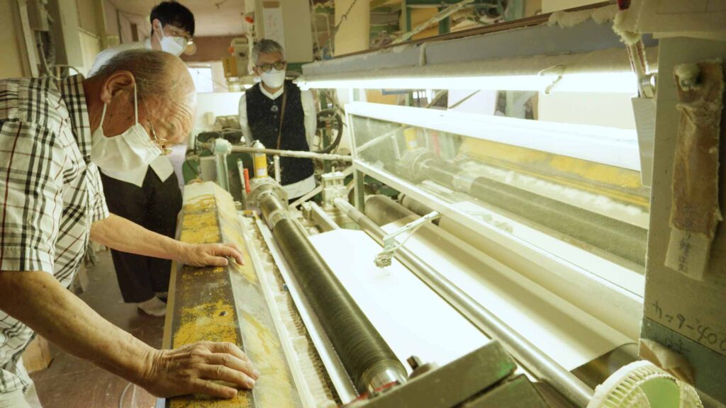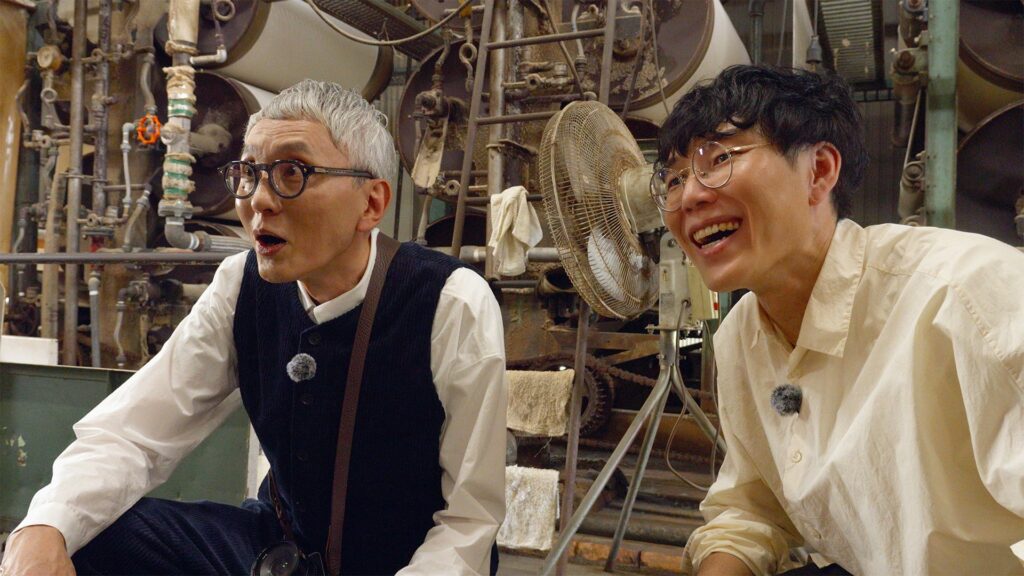 軽くてやわらかなコーデュロイにするための仕上げ作業を見学した松重が「まるで地獄めぐり」と表現するほどの驚きの工程を経て、遠州のコーデュロイは作られていた。