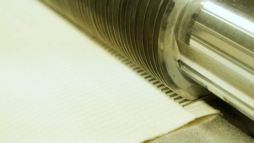コーデュロイの製造は、特有の畝(うね)を作るために、他の生地にはない手間がかかる。生地のよこパイルを切る工程を、遠州ではカッチングと呼び、専門の業者が存在する。磐田市福田地区のカネタカ石田さんで、カッチングを見せていただいた。